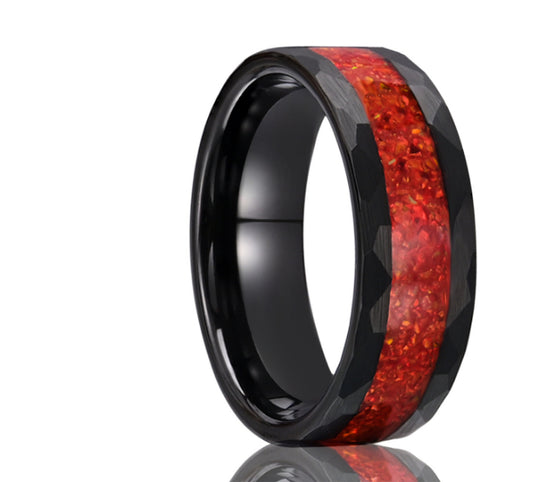 Men’s Black Tungsten Carbide Ring | Red Opal Inlay Statement Band